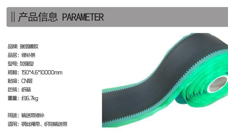 RT-EP400。粘接工藝,配合瑞塔供應(yīng)的冷硫化膠水T粘接良好,對(duì)于大面積穿透和非穿透撕裂都有著較好的粘接修補(bǔ)。?修補(bǔ)條產(chǎn)品詳情:產(chǎn)品介紹:橡膠修補(bǔ)條寬度有:1、加強(qiáng)型修補(bǔ)條(帶織物層):100mm、150mm、220mm、300mm、40